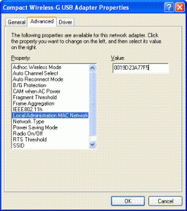 Pilih Tab Advance >>> pilih Local Administration Mac Network dan ganti value -nya dengan Mac Address yang baru dan klik tombol OK.